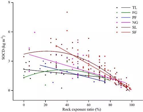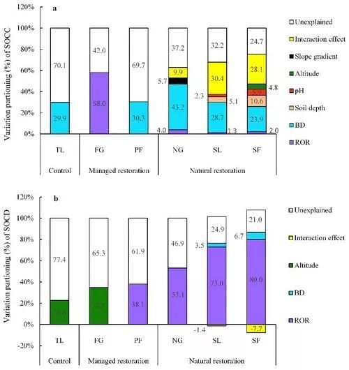 針對這一科學(xué)問題,在王克林和張偉指導(dǎo)下,研究組以耕地為對照,通過分析人工恢復(fù)方式(人工牧草、人工經(jīng)濟林)和自然恢復(fù)方式(撂荒草地、灌木林、次生林)下土壤有機碳變化特征并記錄相應(yīng)的環(huán)境因子信息,解析了不同恢復(fù)模式(人工恢復(fù)和自然恢復(fù))土壤有機碳積累變化規(guī)律,并揭示了其相應(yīng)的環(huán)境驅(qū)動因子。研究發(fā)現(xiàn),自然恢復(fù)模式土壤有機碳含量顯著高于人工恢復(fù)模式和耕地,而短期內(nèi)(9年)人工恢復(fù)模式和耕地之間有機碳含量無顯著差異。不考慮基巖出露對土壤有機碳儲量影響,各植被類型之間有機碳儲量無顯著差異,剔除基巖出露影響后,自然恢復(fù)植被下有機碳儲量顯著高于人工恢復(fù)植被和耕地。方差分解表明,人工恢復(fù)方式下土壤有機碳含量和儲量僅部分變異受環(huán)境因子(如基巖出露率、土壤容重、海拔)影響;而在自然恢復(fù)方式下,環(huán)境因子能有效解釋有機碳含量和儲量的大部分變異,且隨著植被正向演替解釋量逐漸增加,但有機碳含量和儲量的環(huán)境驅(qū)動因子并不相同,前者受多個環(huán)境因子共同驅(qū)動(如土壤容重、基巖出露率、土層深度、pH等),后者則主要受基巖出露率驅(qū)動?;趯Σ煌謴?fù)模式下有機碳含量和儲量變化分析及其環(huán)境驅(qū)動因子評估結(jié)果表明,相比人工恢復(fù)模式,短期內(nèi)自然恢復(fù)更有利于土壤碳固持,且上述環(huán)境因子可作為評估自然恢復(fù)模式下土壤碳庫變化的重要指標。