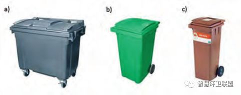 為了進(jìn)行廢物的投放,產(chǎn)業(yè)所有者或物業(yè)管理公司應(yīng)當(dāng)為住宅提供生活垃圾的投放點(diǎn)。投放時(shí)采用的容器分為普通容器(更為常用)和埋入式容器(正在普及)兩種。常用的普通投放容器分別為140升(圖8中c)、240升(圖8中b)、600升(圖8中a)這三種。普通投放容器的缺點(diǎn)是,雖然容積不大,但卻會(huì)占據(jù)將對(duì)較大的空間。埋入式容器部分設(shè)置于地下,內(nèi)部配備高強(qiáng)度織物容納袋,容納能力遠(yuǎn)高于普通容器,能夠在節(jié)省空間的同時(shí),起到降低收運(yùn)頻次的作用。收運(yùn)時(shí),收運(yùn)車輛會(huì)將織物袋從容器中取出,通過打開袋底的機(jī)關(guān)清空廢物。