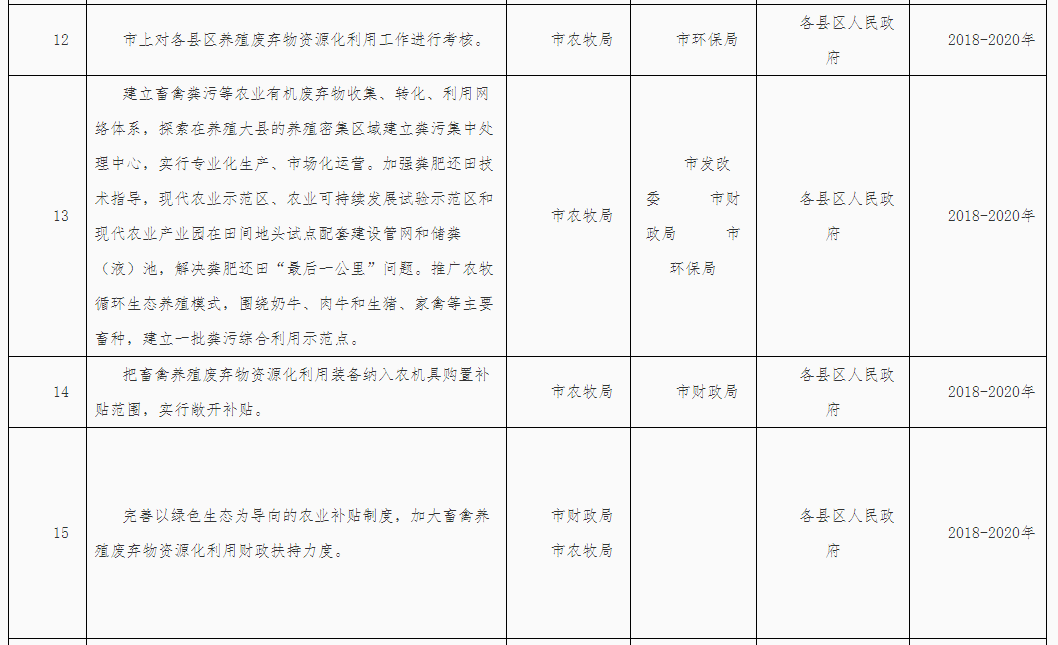 4.政府引導,市場運作。健全完善以綠色生態(tài)為導向的農(nóng)業(yè)補貼制度,建立企業(yè)投入為主、政府支持、社會資本積極參與的市場化運營機制,引導和鼓勵社會資本投入,培育發(fā)展畜禽養(yǎng)殖廢棄物資源化利用產(chǎn)業(yè)。