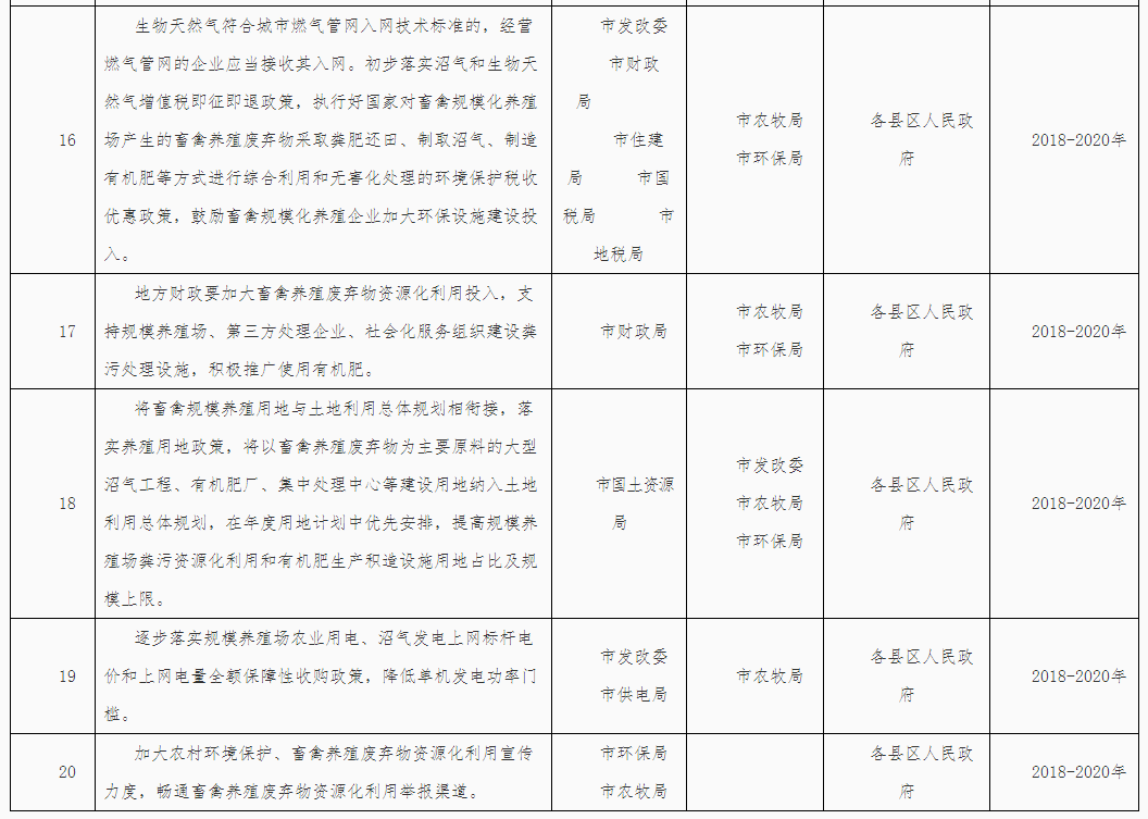 (五)推動種養(yǎng)循環(huán)發(fā)展。各縣區(qū)要盡快編制種養(yǎng)循環(huán)發(fā)展規(guī)劃,引導建立糧飼統(tǒng)籌、農(nóng)牧結合、養(yǎng)防并重、種養(yǎng)一體的種養(yǎng)循環(huán)綠色發(fā)展機制,促進畜牧業(yè)持續(xù)健康發(fā)展。推動建立畜禽糞污等農(nóng)業(yè)有機廢棄物收集、轉化、利用網(wǎng)絡體系,支持采取政府和社會資本合作(PPP)模式,調動社會資本在養(yǎng)殖密集區(qū)域建立糞污集中處理中心,探索規(guī)?;I(yè)化、社會化運營機制,加快畜禽糞污處理全產(chǎn)業(yè)鏈建設。培育壯大多種類型的糞污處理社會化服務組織,實行專業(yè)化生產(chǎn)、市場化運營。鼓勵建立受益者付費機制,保障第三方處理企業(yè)和社會化服務組織合理收益。加強糞肥還田技術指導,鼓勵沼液和經(jīng)無害化處理的畜禽養(yǎng)殖廢水作為肥料科學還田利用。優(yōu)先支持現(xiàn)代農(nóng)業(yè)示范區(qū)、農(nóng)業(yè)可持續(xù)發(fā)展試驗示范區(qū)和現(xiàn)代農(nóng)業(yè)產(chǎn)業(yè)園在田間地頭配套建設管網(wǎng)和儲糞(液)池等方式,解決糞肥還田“最后一公里”問題。到2020年新(改擴)建大中型沼氣21處,新(改擴)建有機肥生產(chǎn)企業(yè)5家。