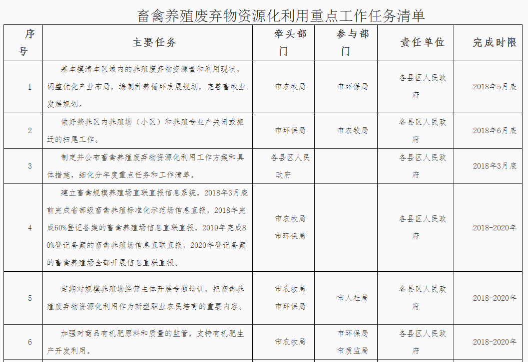 (三)落實屬地管理責任。落實“菜籃子”市長負責制,堅持保供給與保環(huán)境并重,統(tǒng)籌畜產(chǎn)品供給和畜禽糞污治理。各縣區(qū)政府對本行政區(qū)域內的畜禽養(yǎng)殖廢棄物資源化利用工作負總責,要結合本地實際,依法明確部門職責,構建責任體系,健全工作機制,加大資金投入,完善政策措施,強化日常監(jiān)管,確保各項任務落實到位。各縣區(qū)人民政府應于2018年3月底前制定并公布畜禽養(yǎng)殖廢棄物資源化利用工作方案,細化分年度的重點任務和工作清單,并抄送市農(nóng)牧局備案。