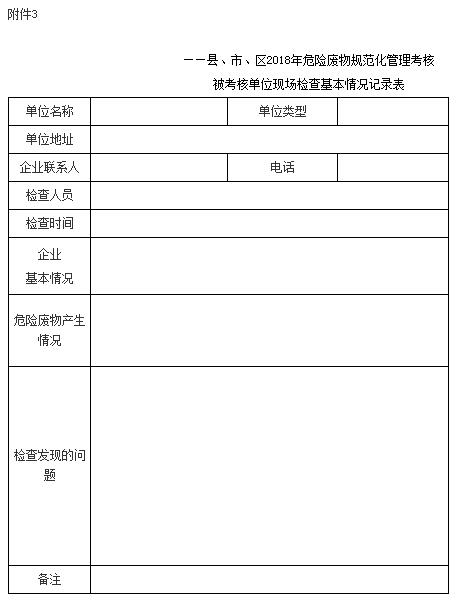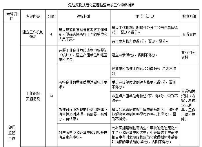 (一)縣、市、區(qū)自查考核。各縣、市、區(qū)環(huán)保局由固體廢物管理、環(huán)境監(jiān)察、環(huán)境監(jiān)測等相關(guān)業(yè)務(wù)部門組成考核組,對產(chǎn)廢單位和經(jīng)營單位進行自查考核。自查考核應(yīng)嚴(yán)格執(zhí)行環(huán)境保護部《危險廢物規(guī)范化管理指標(biāo)體系》(環(huán)辦〔2015〕99號)規(guī)定的考核內(nèi)容和評分標(biāo)準(zhǔn),不得隨意放寬標(biāo)準(zhǔn)??己藭r填寫《被考核單位現(xiàn)場檢查基本情況記錄表》(見附件3)??h級環(huán)保部門自查考核和復(fù)查工作于5月31日前完成,考核結(jié)果及工作報告(工作報告按附件4格式,附考核結(jié)果匯總表)于6月10日前報市局