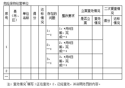 各縣、市、區(qū)環(huán)保局對產(chǎn)廢單位、經(jīng)營單位開展危險廢物規(guī)范化管理自查考核,并對自查考核發(fā)現(xiàn)問題及整改情況組織復(fù)查。