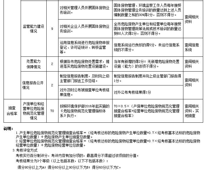 對各縣、市、區(qū)環(huán)保局危險廢物規(guī)范化管理抽查考核工作,按照《危險廢物規(guī)范化管理檢查考核工作評級指標(biāo)》(見附件5)執(zhí)行,考核比例不低于30%。