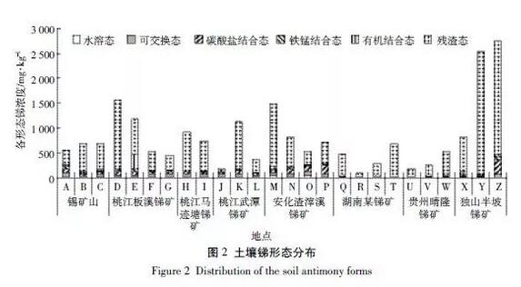 銻的金屬性不強,易形成銻的衍生物(銻化物、氫化物、有機銻化物等),其毒性的大小不僅與其總量有關,很大程度上還取決于其存在形態(tài)。其中單質(zhì)銻的毒性高于其鹽類,無機銻的毒性高于有機銻,+3 價的毒性高于+5 價(+3 價的毒性大約是+5 價的10 倍),且同等價態(tài)銻的毒性還與其化合物的形態(tài)以及晶體結(jié)構(gòu)有關。銻在土壤中主要以殘渣態(tài)的形式存在,占總銻的比例最高可達90%,水溶態(tài)含量最低(圖 2)。
