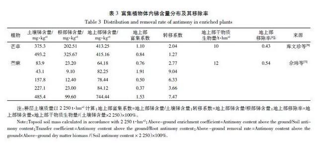 綜上所述,在目前研究較多的2 種銻富集植物中,雖然對銻均有較好的富集效果,但整體移除率不高(移除率基本≤1%),遠低于其他重金屬的富集植物在土壤污染修復中的移除效果(移除率基本≥10%),實際應用潛力不高,尤其是周期較短的農(nóng)田土壤修復中。