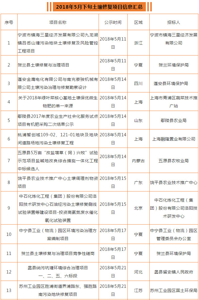 我國土壤修復(fù)市場前景廣闊,很多土壤修復(fù)項目也在如火如荼地進行,5月下旬土壤修復(fù)市場又有哪些項目呢?