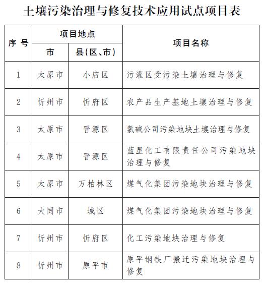 17.推進(jìn)土壤污染治理與修復(fù)項(xiàng)目庫建設(shè),強(qiáng)化土壤污染防治項(xiàng)目儲(chǔ)備。進(jìn)一步推進(jìn)8個(gè)土壤污染治理與修復(fù)技術(shù)應(yīng)用試點(diǎn)項(xiàng)目(見附件),2018年底前完成2個(gè)農(nóng)用地土壤污染治理與修復(fù)試點(diǎn)項(xiàng)目。(責(zé)任單位:各市、縣人民政府,省環(huán)保廳、省農(nóng)業(yè)廳、省財(cái)政廳)