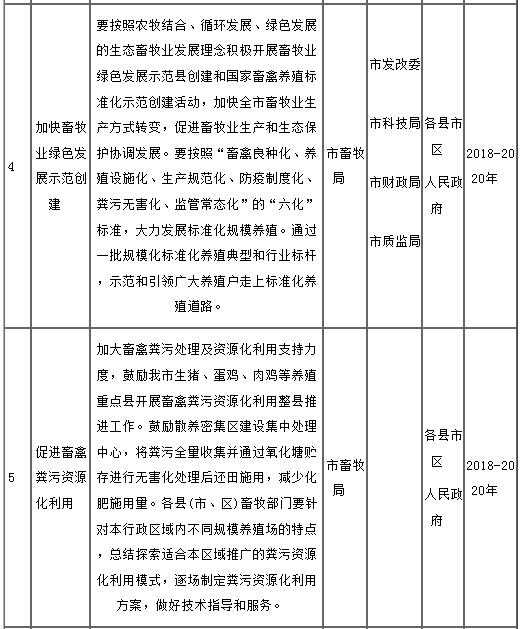 (二)工作目標。到2020年,基本解決畜禽糞污處理和資源化利用問題,構建種養(yǎng)循環(huán)發(fā)展機制,全市畜禽糞污綜合利用率達到75%以上,規(guī)模養(yǎng)殖場糞污處理設施裝備配套率達到95%以上,大型規(guī)模養(yǎng)殖場糞污處理設施裝備配套率提前一年達到100%。申報省級畜牧業(yè)綠色發(fā)展示范縣的縣市區(qū)及國家級畜禽標準化示范企業(yè)率先實現(xiàn)上述目標。