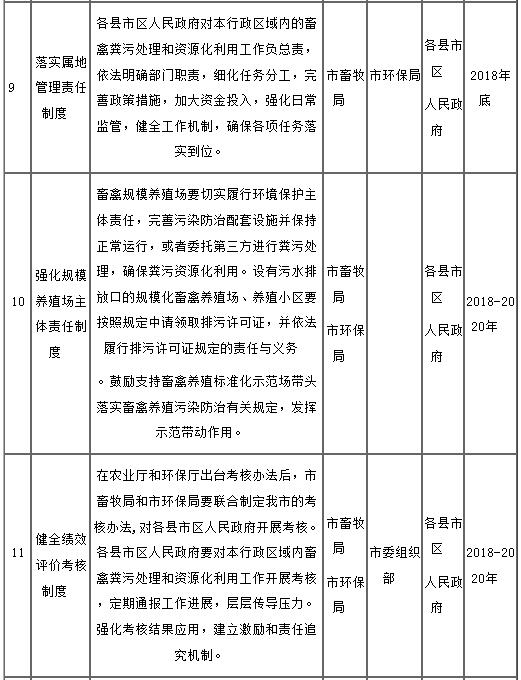 (三)落實屬地管理責任制度。各縣市區(qū)人民政府對本行政區(qū)域內(nèi)的畜禽糞污處理和資源化利用工作負總責,在工作推進中,依法明確部門職責,細化任務分工,完善政策措施,加大資金投入,強化日常監(jiān)管,健全工作機制,確保各項任務落實到位。各縣市區(qū)人民政府要按照本方案的主要目標要求,確定分年度重點任務,列出工作清單,于2018年7月底前抄送市畜牧局備案。(市畜牧局牽頭,市環(huán)保局參與)