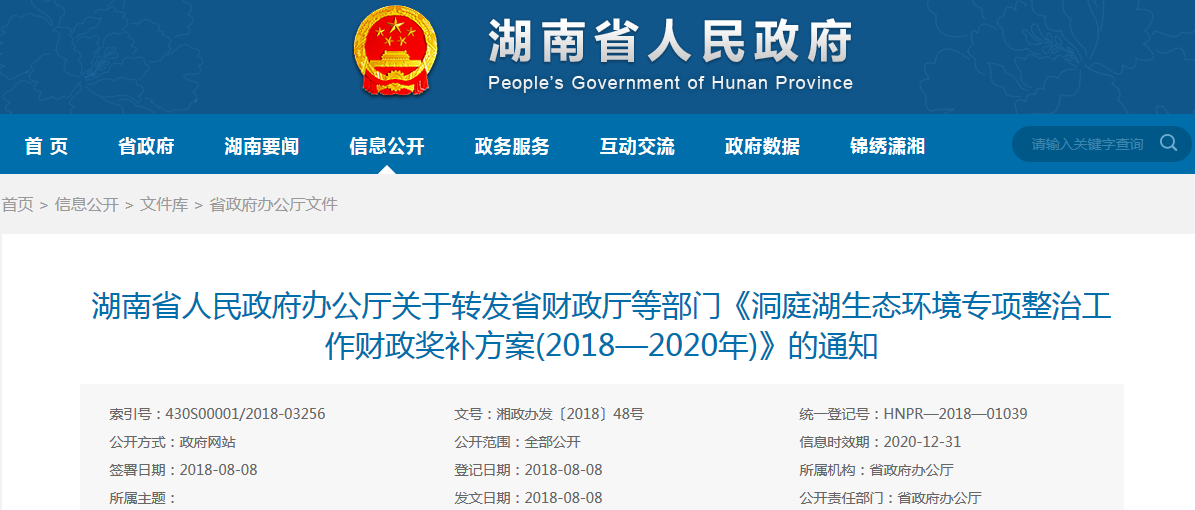 日前,湖南省人民政府辦公廳發(fā)布了關(guān)于轉(zhuǎn)發(fā)省財(cái)政廳等部門(mén)《洞庭湖生態(tài)環(huán)境專(zhuān)項(xiàng)整治工作財(cái)政獎(jiǎng)補(bǔ)方案(2018—2020年)》的通知,具體內(nèi)容如下: