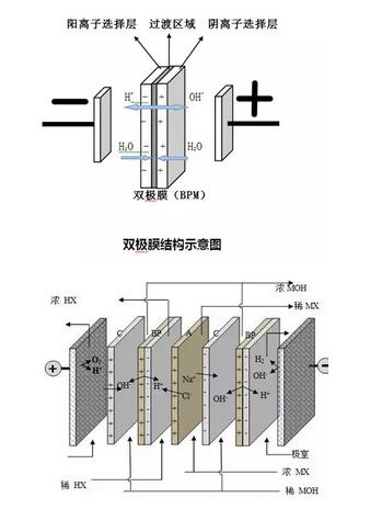 雙極膜亦稱雙極性膜,是特種離子交換膜,它是由一張陽膜和一張陰膜復(fù)合制成的陰、陽復(fù)合膜。該膜的特點(diǎn)是在直流電場的作用下,陰、陽膜復(fù)合層間的H2O解離成H+和OH-并分別通過陰膜和陽膜,作為H+和OH-離子源。在水處理中主要通過離子交換達(dá)到凈化水資源的目的。
