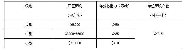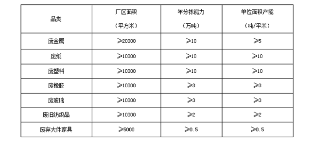 指分揀品類不少于二類,分揀能力和用地面積規(guī)劃設計,應以再生資源分揀用地標準和本區(qū)域再生資源實際產生量為準??煞譃榇?、中、小型三個級別,各級別綜合型分揀中心的年分揀能力和廠區(qū)面積如下: