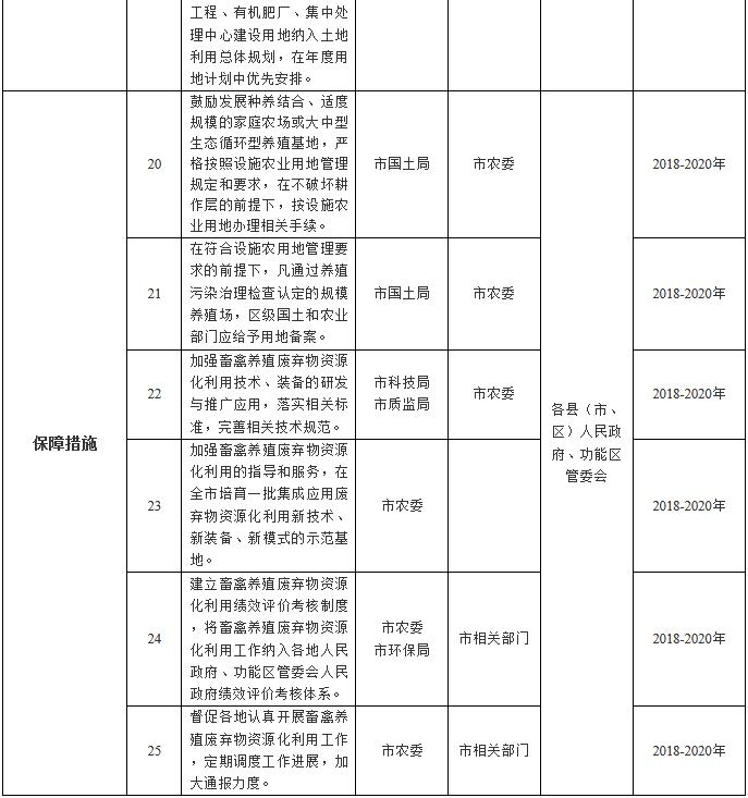 (九)堅持屬地責(zé)任管理。畜禽養(yǎng)殖廢棄物資源化利用實行屬地管理責(zé)任制,各地人民政府、功能區(qū)管委會對本行政區(qū)域內(nèi)的畜禽養(yǎng)殖廢棄物資源化利用工作負(fù)總責(zé),強(qiáng)化組織領(lǐng)導(dǎo),明確部門職責(zé),建立協(xié)調(diào)機(jī)制,加強(qiáng)政策扶持,強(qiáng)化日常監(jiān)管,健全督查制度和巡查機(jī)制,確保各項任務(wù)落實到位。堅持保供給與保生態(tài)并重,落實“菜籃子”市長負(fù)責(zé)制,統(tǒng)籌環(huán)境保護(hù)與畜牧業(yè)協(xié)調(diào)發(fā)展。各縣(市、區(qū))人民政府、功能區(qū)管委會應(yīng)于2018年10月底前制訂并公布畜禽養(yǎng)殖廢棄物資源化利用工作方案,細(xì)化年度重點任務(wù)和工作清單,抄送市農(nóng)委,并報省農(nóng)委備案。