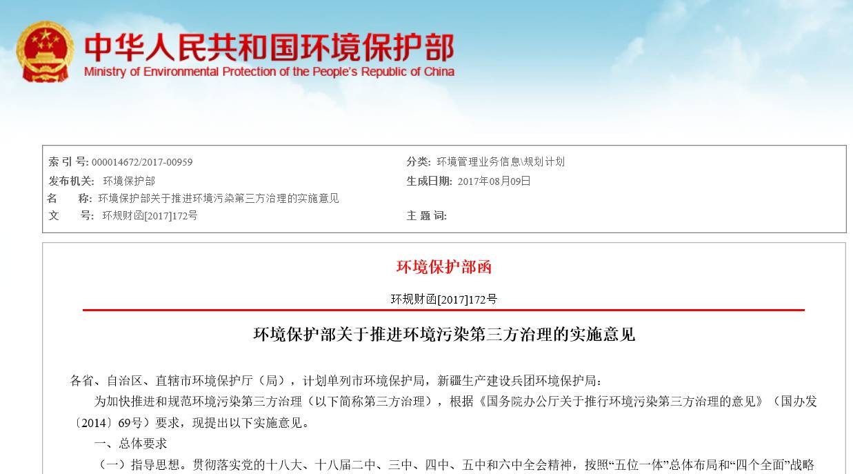 文章導(dǎo)讀 為加快推進(jìn)和規(guī)范環(huán)境污染第三方治理,環(huán)保部發(fā)布《環(huán)境保護(hù)部關(guān)于推進(jìn)環(huán)境污染第三方治理的實施意見》。文件中,細(xì)化環(huán)境污染第三方治理。劃定第三方責(zé)任,指出第三方治理單位應(yīng)建立臺賬記錄,將構(gòu)建第三方治理信息平臺。企業(yè)污染排放超標(biāo)超總量的,將實施第三方限期治理。并提出引入第三方支付機(jī)制,依環(huán)境績效...