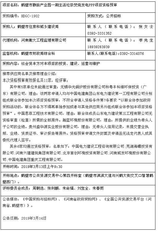 鶴壁市靜脈產(chǎn)業(yè)園一期生活垃圾焚燒發(fā)電PPP項(xiàng)目資格預(yù)審結(jié)果公示推薦閱讀:鶴壁市靜脈產(chǎn)業(yè)園一期生活垃圾焚燒發(fā)電PPP項(xiàng)目資格預(yù)審公告原標(biāo)題:鶴壁市靜脈產(chǎn)業(yè)園一期生活垃圾焚燒發(fā)電PPP項(xiàng)目資格預(yù)審結(jié)果公示