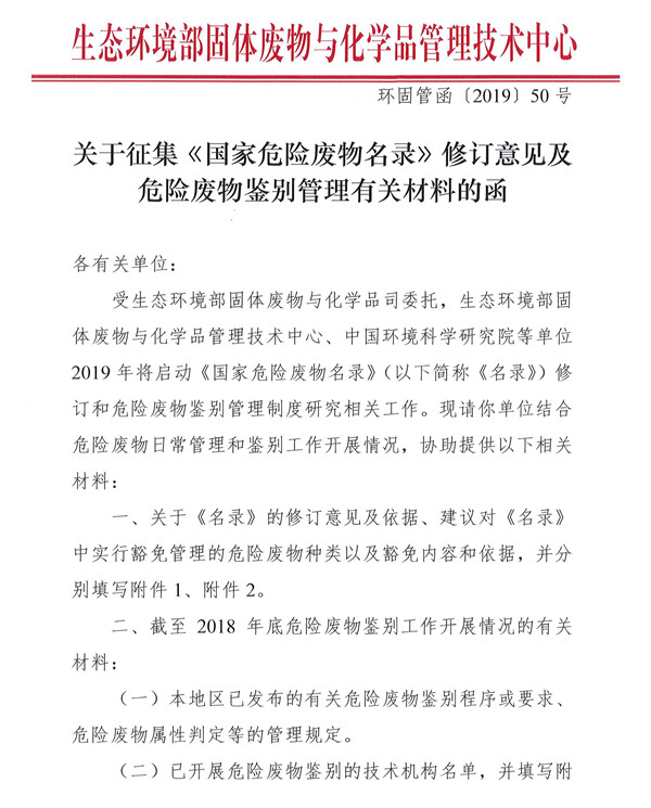 關(guān)于征集《國(guó)家危險(xiǎn)廢物名錄》修訂意見(jiàn)及危險(xiǎn)廢物鑒別管理有關(guān)材料的函原標(biāo)題:關(guān)于征集《國(guó)家危險(xiǎn)廢物名錄》修訂意見(jiàn)及危險(xiǎn)廢物鑒別管理有關(guān)材料的函