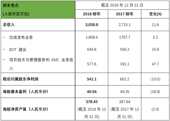 集團(tuán)各業(yè)務(wù)版塊收入增加,2018財(cái)年集團(tuán)總收入達(dá)到人民幣30.3億元。稅后歸屬股東凈利潤為人民幣5.4億元。在2018年12月31日和2017年12月31日,總發(fā)行股數(shù)為1,443,246,800和1,221,581,000。(新加坡,2019年3月3日) - 中國領(lǐng)先的垃圾焚燒發(fā)電(“WTE”)運(yùn)...