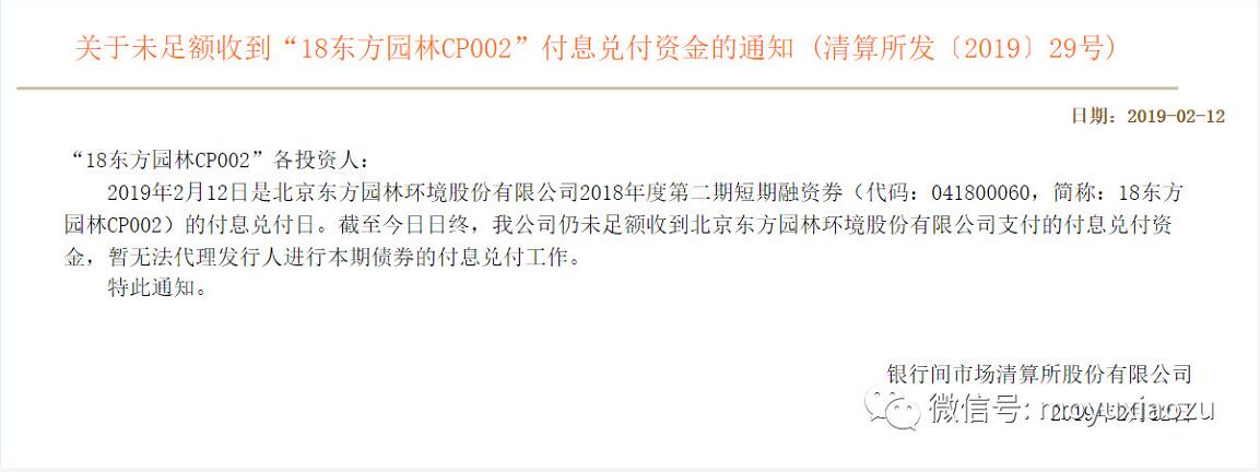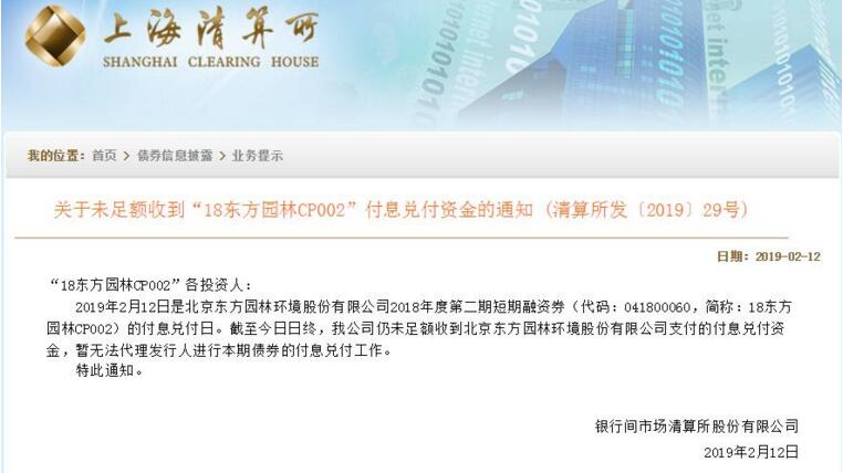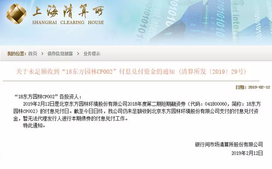 因?yàn)槎倘谌茨苋缙趦陡?,再次讓市?chǎng)神經(jīng)繃緊。2月12日下午,銀行間市場(chǎng)清算所股份有限公司(簡(jiǎn)稱上海清算所)公告稱,2月12日是北京東方園林環(huán)境股份有限公司2018年度第二期短期融資券“18東方園林CP002”的付息兌付日。截至日終,仍未足額收到東方園林支付的付息兌付資金,暫無(wú)法代理發(fā)行人進(jìn)行本期債券...