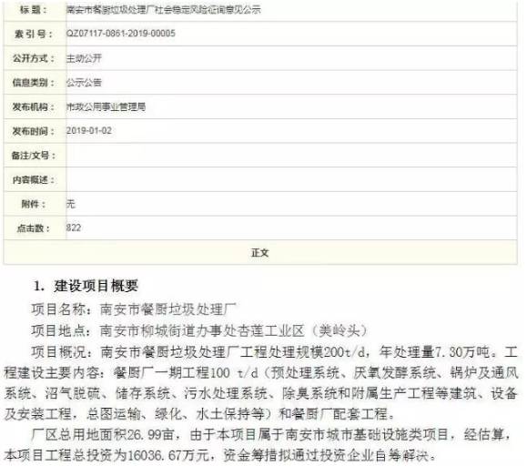 2019年1月2日,南安市政公用事業(yè)管理局發(fā)布兩份《社會穩(wěn)定風(fēng)險征詢意見公示》,主要內(nèi)容關(guān)于南安市生活垃圾焚燒發(fā)電廠提級改造,以及南安市餐廚垃圾處理廠建設(shè)兩項工程。具體如下:南安市生活垃圾焚燒發(fā)電廠提級改造工程項目位于柳城街道杏蓮工業(yè)區(qū)(美嶺頭),提級改造后日處理垃圾量將達到每日1500噸,年處理量...