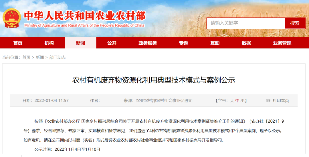 為貫徹落實《農(nóng)村人居環(huán)境整治提升五年行動方案(2021—2025年)》部署要求,提高農(nóng)村易腐垃圾、廁所糞污等有機廢棄物無害化處理和資源化利用水平,強化實用技術(shù)供給,農(nóng)業(yè)農(nóng)村部、國家鄉(xiāng)村振興局在各省(區(qū)、市)推薦的基礎(chǔ)上,經(jīng)專家評審、實地核查,遴選了4種農(nóng)村有機廢棄物資源化利用典型技術(shù)模式和7個典型案...