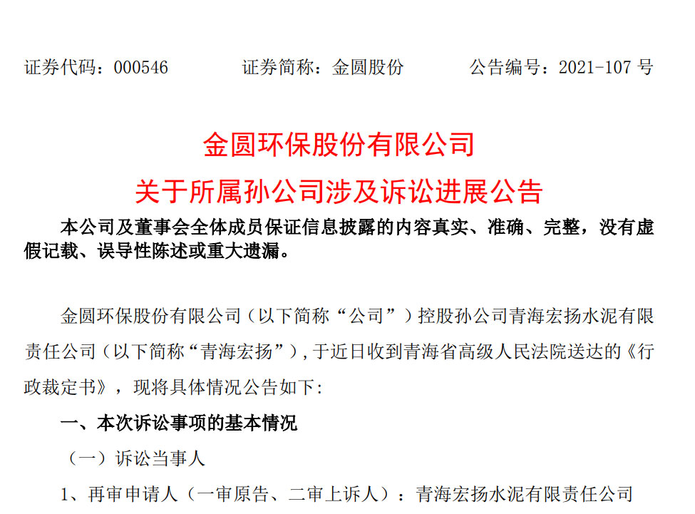 因為5萬元的環(huán)保處罰,導(dǎo)致3655萬元稅收優(yōu)惠沒有了,是不是有點因小失大?2021年12月29日,金圓環(huán)保股份有限公司(下稱“金圓股份”)發(fā)布公告,宣布了一起所屬孫公司青海宏揚水泥有限責任公司(下稱“青海宏揚”)涉及訴訟的進展,青海宏揚要求確認環(huán)保處罰無效的再審申請被法院駁回。這意味著,經(jīng)歷了一審、...