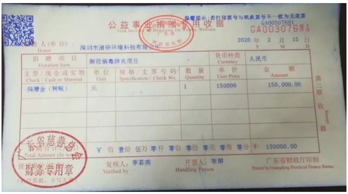 為表達對前線抗疫戰(zhàn)士的敬意和支持,2020年2月13日,深圳市清研環(huán)境科技有限公司向廣東省慈善基金會捐助現(xiàn)金15萬元。同時,清研環(huán)境骨干員工組成的“戰(zhàn)狼團隊”也自發(fā)捐助3.25萬元用于為抗疫戰(zhàn)士購買愛心物資,其中第一批愛心物資已于當天交給支援武漢的廣東醫(yī)療隊醫(yī)護人員。廣東省慈...
