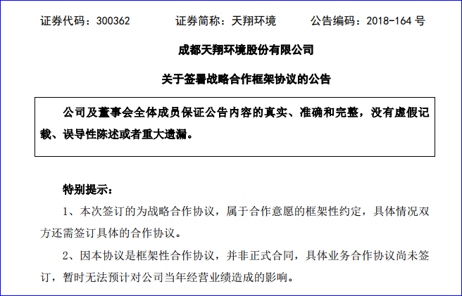 2018年12月24日,天翔環(huán)境公告稱,公司與四川能投水務(wù)投資有限公司在12月21日已經(jīng)正式簽訂了《戰(zhàn)略合作框架協(xié)議》。此次戰(zhàn)略合作協(xié)議的簽訂,意味著陷入債務(wù)泥淖的天翔環(huán)境,再次迎來(lái)又一家地方國(guó)資的的“馳援”。 根據(jù)協(xié)議內(nèi)容,雙方擬在本協(xié)議正式簽署后組建專業(yè)團(tuán)隊(duì),對(duì)所涉及合作...