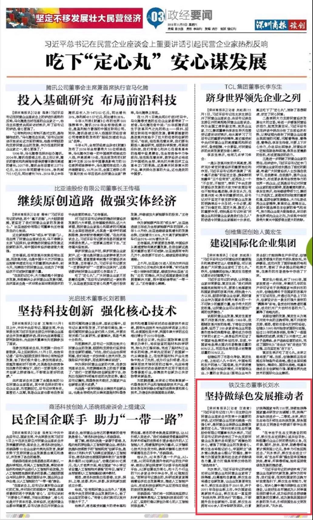 近日,習(xí)近平總書記在民營企業(yè)座談會(huì)上的重要講話引起民營企業(yè)家熱烈反響,鐵漢生態(tài)作為生態(tài)環(huán)保龍頭民營企業(yè),劉水董事長(zhǎng)積極回應(yīng)。在11月3日《深圳商報(bào)》刊登的“堅(jiān)定不移發(fā)展壯大民營經(jīng)濟(jì)”專題報(bào)道中,劉水表示,習(xí)近平總書記的講話切實(shí)讓民營企業(yè)和民營企業(yè)家有了獲得感、歸屬感和自豪感。鐵漢生態(tài)將銘記初心,牢固...