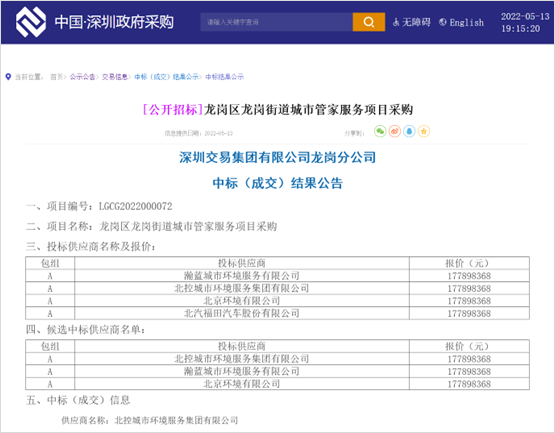 兩標(biāo)20億元,北控城市服務(wù)“城市大管家”之路越走越寬廣。深圳政府采購網(wǎng)消息,2022年5月13日,深圳市龍崗區(qū)平湖街道城市管家服務(wù)項目公布中標(biāo)結(jié)果,在與北京環(huán)境有限公司、瀚藍(lán)城市環(huán)境服務(wù)有限公司、北汽福田汽車股份有限公司的同場較量中,北控城市環(huán)境服務(wù)集團(tuán)有限公司成功勝出。成交信息如下:供應(yīng)商名稱:北...