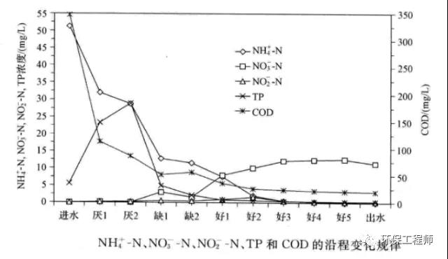 本文通過(guò)一張AAO系統(tǒng)內(nèi)污染物的變化曲線(xiàn)針對(duì)每個(gè)段的的水質(zhì)情況進(jìn)行數(shù)據(jù)進(jìn)行分析,了解完這個(gè)就可以快速知道自己系統(tǒng)的問(wèn)題,其中,各個(gè)單元均是取樣沉淀后,測(cè)定的上清液濃度。 1、AAO系統(tǒng)全流程的COD變化 從曲線(xiàn)中看出:進(jìn)水COD350mg/l左右,厭氧1段:100mg/l左右,厭氧2段:75左右,缺...